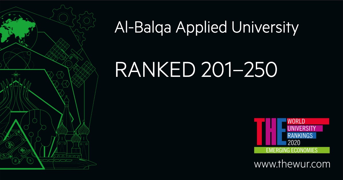 البلقاء التطبيقية تحلق من جديد في سماء التصنيفات العالمية جامعة البلقاء التطبيقية ضمن الفئة 201-250 في تصنيف التايمز العالمي لجامعات الدول ذات الاقتصادات الناشئة 2020