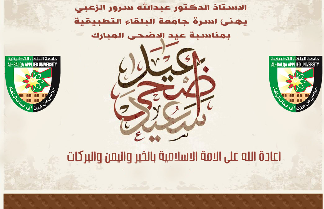 يتقدم الأستاذ الدكتور عبد الله سرور الزعبي من أعضاء الهيئتين التدريسية والإدارية وطلبة الجامعة بالتهنئة والتبريك بمناسبة حلول عيد الأضحى المبارك، أعاده الله على الوطن وقائده جلالة الملك عبد الله الثاني ابن الحسين المعظم والأسرة الأردنية والأمتين العربية والإسلامية بالخير واليمن والبركات.