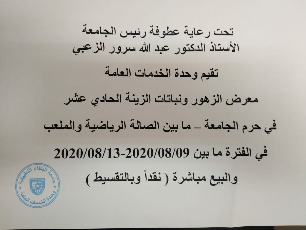 تحت رعاية رئيس جامعة البلقاء التطبيقية الاستاذ الدكتور عبدالله سرور الزعبي تقيم وحدة الخدمات العامة معرض الزهور ونباتات الزينة الحادي عشر في حرم الجامعة ( بالمنطقة الواقعة بين الصالة الرياضية والملعب ) في الفترة من ( 9 _ 13 / 8 / 2020 ) والبيع مباشرة نقدا وبالتقسيط .