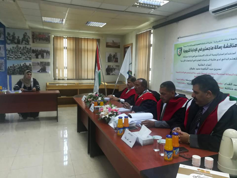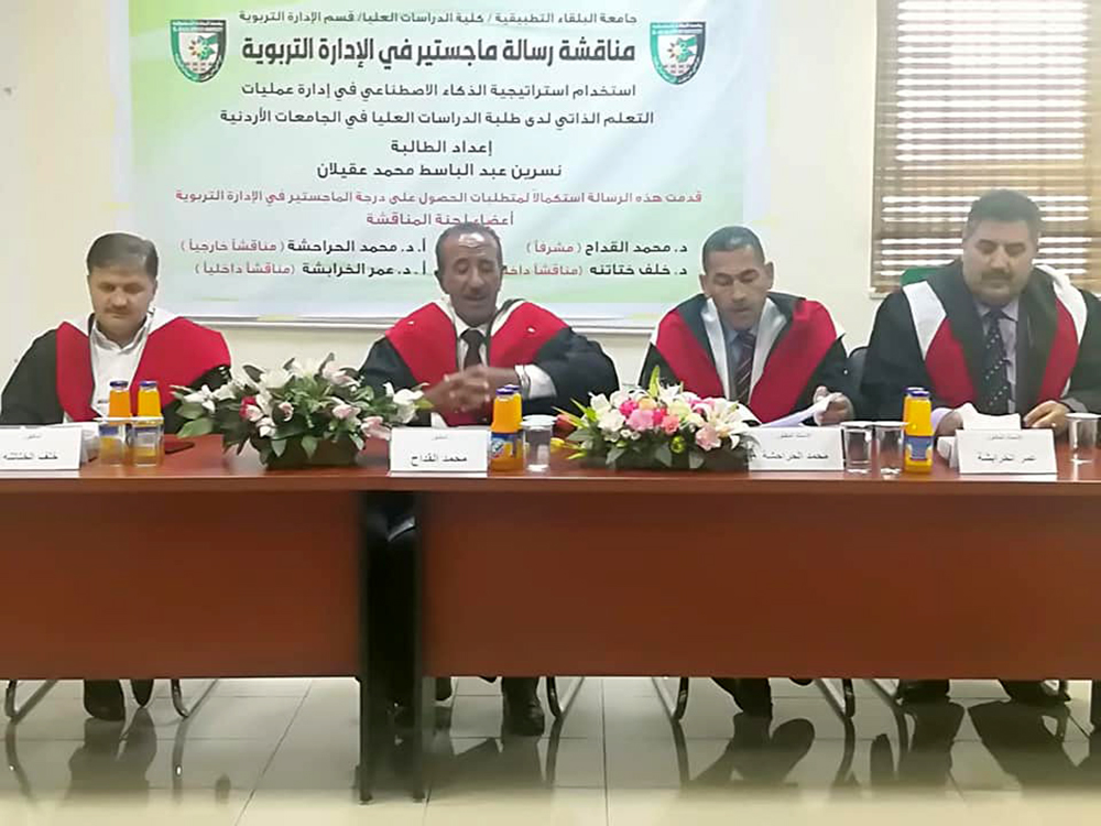 تم في صباح يوم الأحد الموافق 9/8/2020 ، مناقشة رسالة ماجستير للطالبة نسرين عبدالباسط محمد عقيلان تخصص الإدارة التربوية، قسم العلوم التربوية، بعنوان ( استخدام استراتيجية الذكاء الاصطناعي في إدارة عمليات التعلم الذاتي لدى طلبة الدراسات العليا في الجامعات الاردنية )