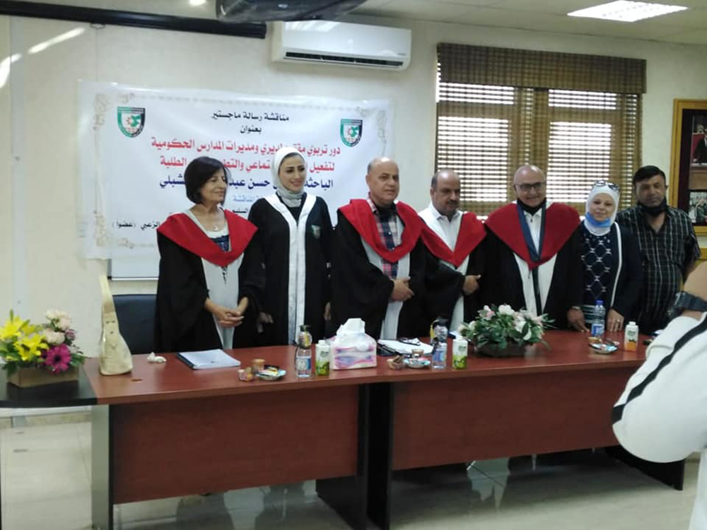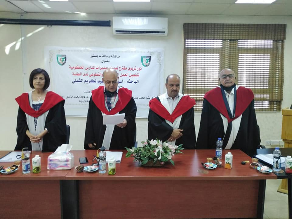 تم في صباح يوم السبت الموافق 22/8/2020 ، مناقشة رسالة ماجستير للطالبة أسيل حسن عبدالكريم الشبلي  تخصص الإدارة التربوية،  قسم العلوم التربوية، بعنوان ( دور تربوي مقترح لمديري ومديرات المدارس الحكومية لتفعيل العمل الاجتماعي التطوعي لدى الطلبة)