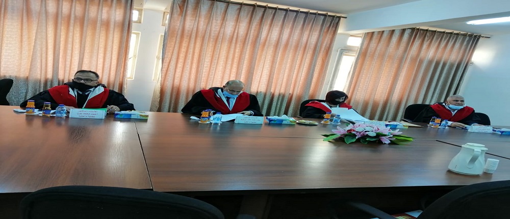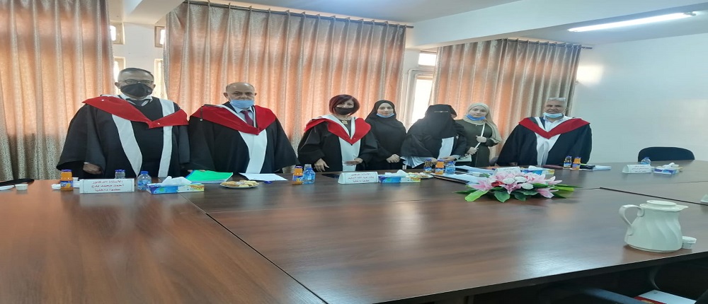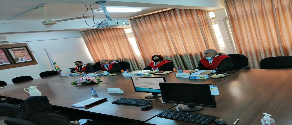 برئاسة الدكتورة دلال الزعبي من كلية اربد الجامعية مناقشا ورئيسا و الاستاذ الدكتور بشار عبدالله السليم مناقشاً داخلياً /كلية الاميره عاليه والاستاذ الدكتور  محمد ابدح  مناقشاً داخلياً /كلية الاميره عاليه والاستاذ الدكتور خليفة مصطفى  أبو عاشور مناقشاً خارجياً /جامعة اليرموك وتم منح الطالبة درجة الماجستير.