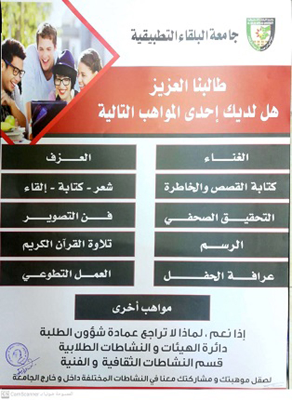 تعلن عمادة شؤون الطلبة لكافة طلبة الجامعه والراغبين بتسجل أسماؤهم في إحدى المواهب المرففة في البوست الدخول الى الرابط ادناه