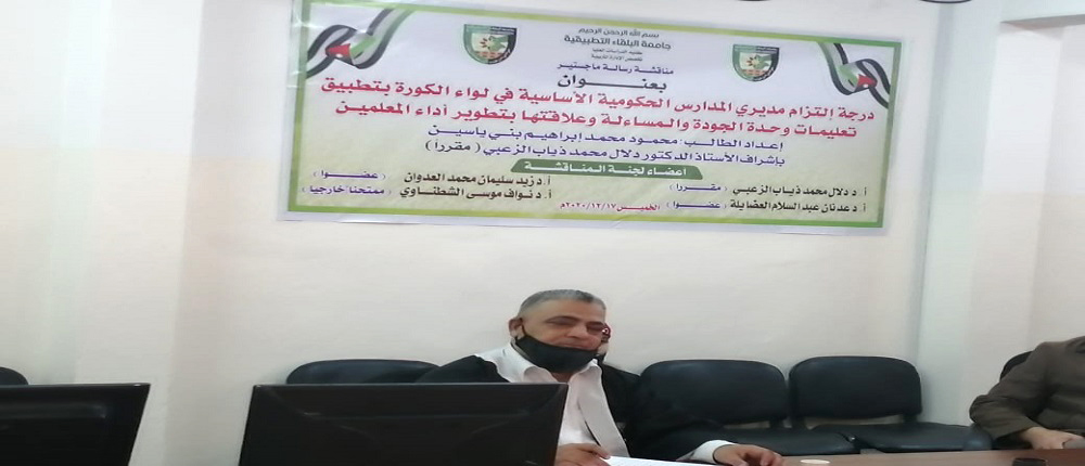 قدمها الطالب محمود محمد ابراهيم بني ياسين بعنوان " درجة التزام مديري المدارس الحكومية الاساسية في لواء الكورة بتطبيق تعليمات وحدة الجودة والمساءله وعلاقتها بتطوير آداء المعلمين" بإشراف الاستاذ الدكتورة دلال محمد الزعبي من كلية اربد الجامعية / جامعة البلقاء التطبيقية مقررا" وعضوية كل من الاستاذ الدكتور عدنان عبد السلام العضايلة من جامعة البلقاء التطبيقية والاستاذ الدكتور نواف موسى الشطناوي من جامعة اليرموك ممتحنا" خارجياً والاستاذ الدكتور زيد سليمان العدوان من كلية عالية /جامعة البلقاء التطبيقية.