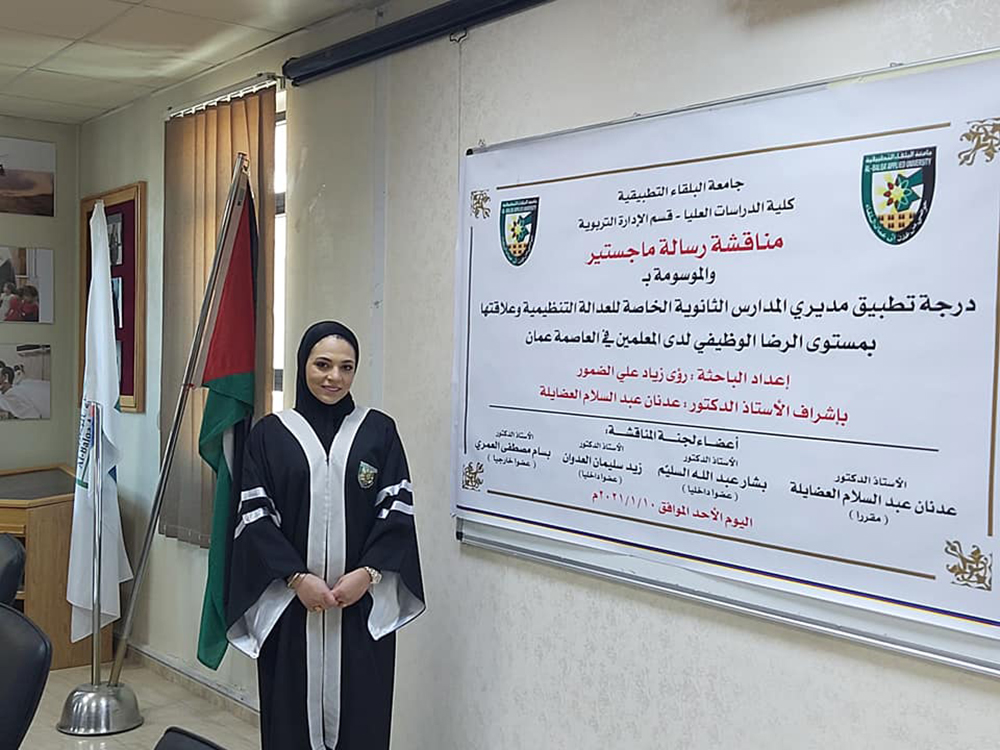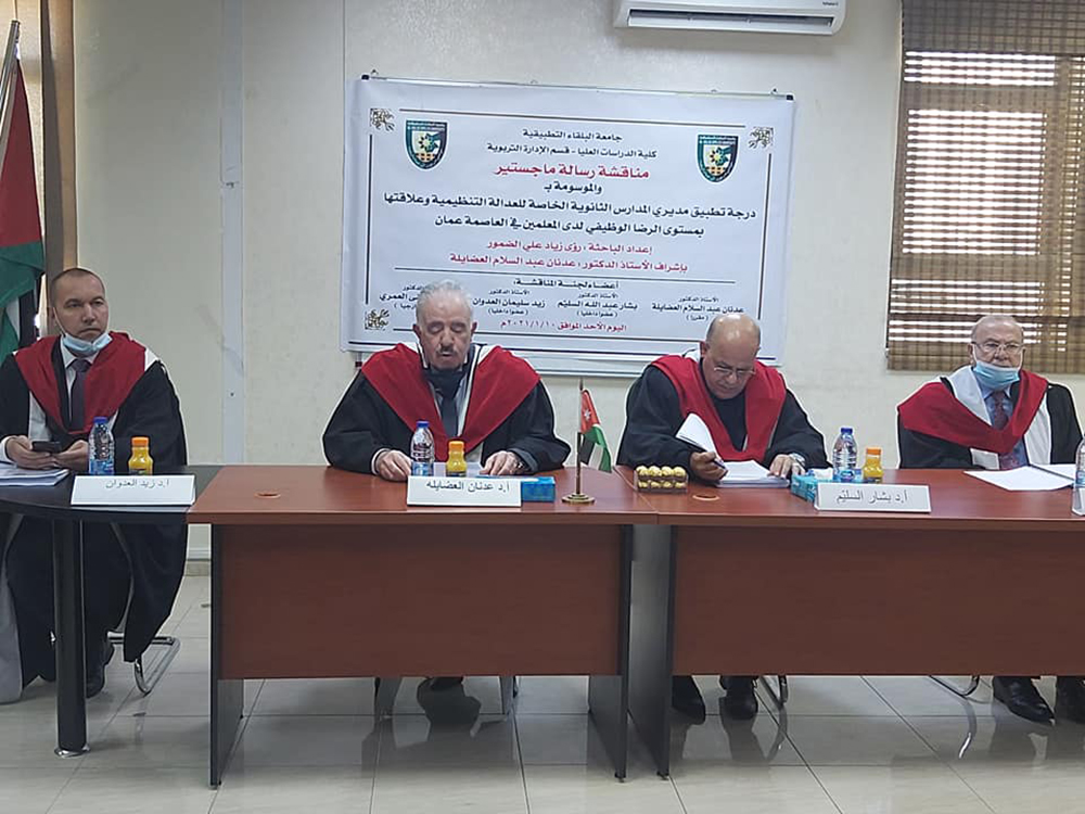 تم في صباح يوم الأحد الموافق 10/1/2021 ، مناقشة رسالة ماجستير للطالبة رؤى زياد علي الضمور تخصص الادارة التربوية، قسم العلوم التربوية بعنوان (درجة تطبيق مديري المدارس الثانوية الخاصة للعدالة التنظيمية وعلاقتها بمستوى الرضا الوظيفي لدى المعلمين في العاصمة عمان )