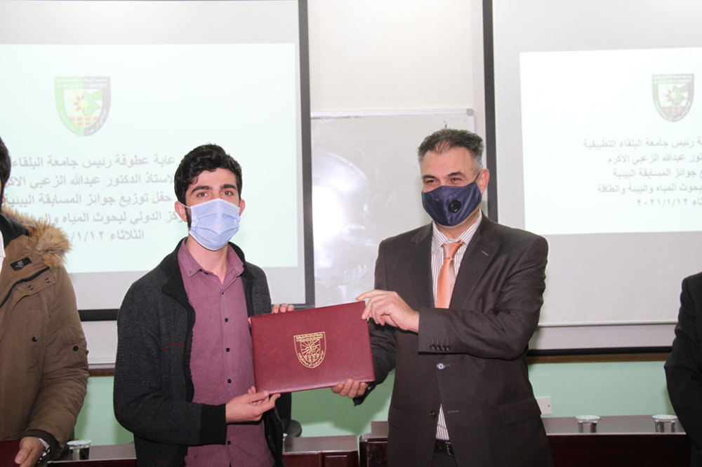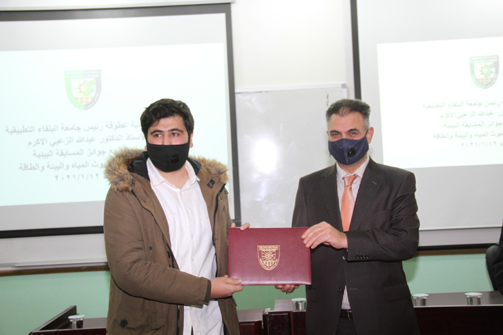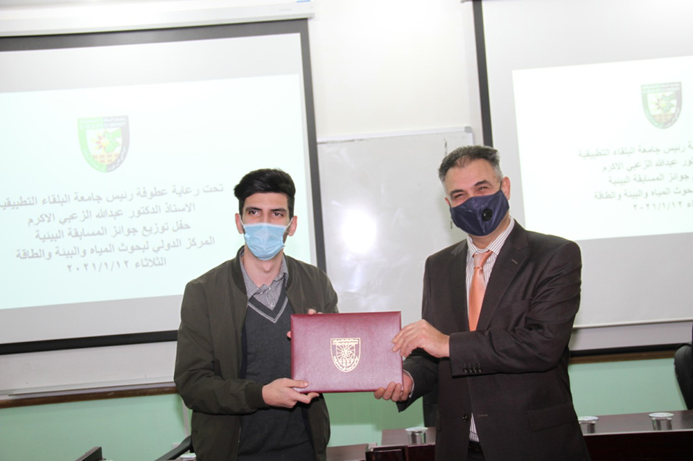 بدوره قال الأستاذ الدكتور محمد أبو ديه مدير المركز الدولي لبحوث المياه والبيئة والطاقة أن جامعة البلقاء التطبيقية أخذت عهدا أن لا تنأى عن مسيرة الإنجاز وأن تكون دائما في الركب مشيرا إلى أنها صنعت مجدا يليق بها لافتا أن الجامعة تكرم اليوم ثلة من أبناءها الطلبة الذين تميزوا في المشاركة بالمسابقة البيئية والتي تأتي كنوع من المشاركة المجتمعية لرفع الوعي البيئي بين طلبة الجامعة.