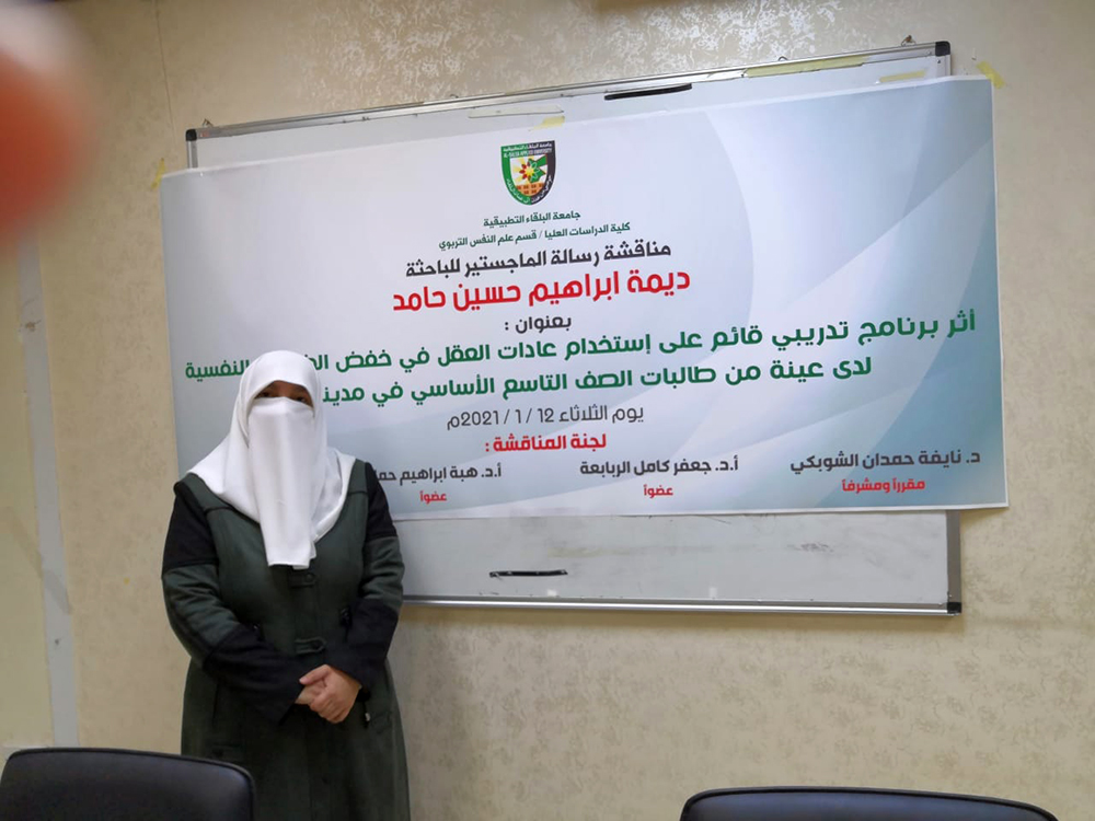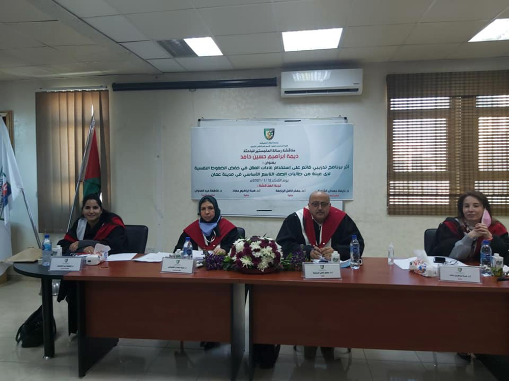 تم في صباح يوم االثلاثاء الموافق 12/1/2021  ، مناقشة رسالة ماجستير للطالبة ديمة ابراهيم حسين حامد تخصص علم النفس التربوي،  قسم علم النفس والتربية الخاصىة بعنوان (أثر برنامج تدريبي قائم على استخدام عادات العقل في خفض الضغوط النفسية لدى عينة من طالبات الصف التاسع الأساسي في مدينة عمان )
