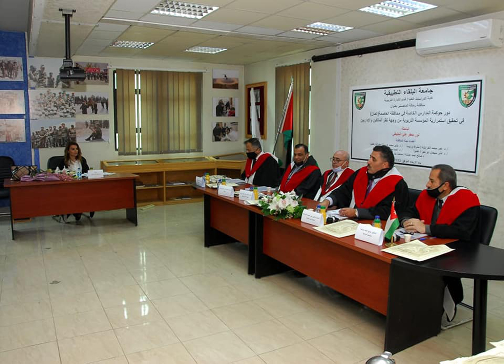 تم في صباح يوم الأربعاء الموافق 13/1/2021، مناقشة رسالة ماجستير للطالبة نور جعفر علي الحنيطي تخصص الإدارة التربوية ، قسم العلوم التربوية بعنوان (دور حوكمة المدارس الخاصة في محافظة العاصمة "عمان" في تحقيق استمرارية المؤسسة التربوية من وجهة نظر المالكين والإداريين)
