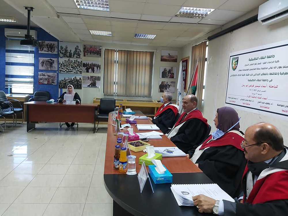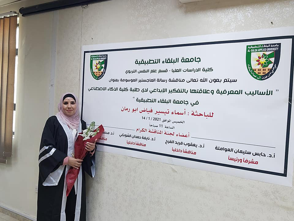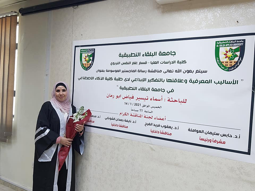 تم في صباح يوم الخميس الموافق 14/1/2021، مناقشة رسالة ماجستير للطالبة أسماء تيسير فياض أبو رمان تخصص علم النفس التربوي ، قسم علم النفس والتربية الخاصة ( الأساليب المعرفية وعلاقتها بالتفكير الإبداعي لدى طلبة كلية الذكاء الاصطناعي في جامعة البلقاء التطبيقية )