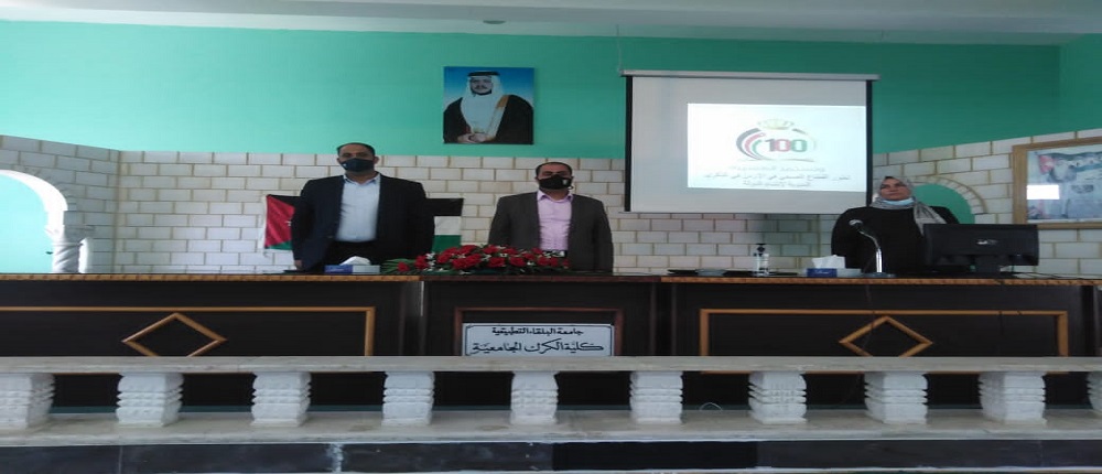 تحت رعاية عميد كلية الكرك الجامعية الاستاذ الدكتور محمد نايف الصرايره عقدت كلية الكرك الجامعية ندوة بمناسبة الاحتفال بمئوية الدولة الأردنية واختصت هذه الندوة بالحديث عن الواقع الصحي وتطوره عبر المئوية الاولى من عمر الدولة الأردنية وكيف أن المئوية شهدت تطورات صحية عظيمة منذ بداية نشأة الدولة الأردنية