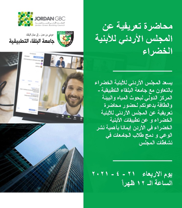 إيماناً بأهمية نشر الوعي و دمج طلاب الجامعات في نشاطات المجلس، يدعوكم المجلس الأردني للأبنية الخضراء بالتعاون مع جامعة البلقاء التطبيقية / المركز الدولي لبحوث المياه والبئة والطاقة بدعوتكم لحضور محاضرة تعريفية عن المجلس الأردني للأبنية الخضراء و عن تطبيقات الأبنية الخضراء في الأردن.