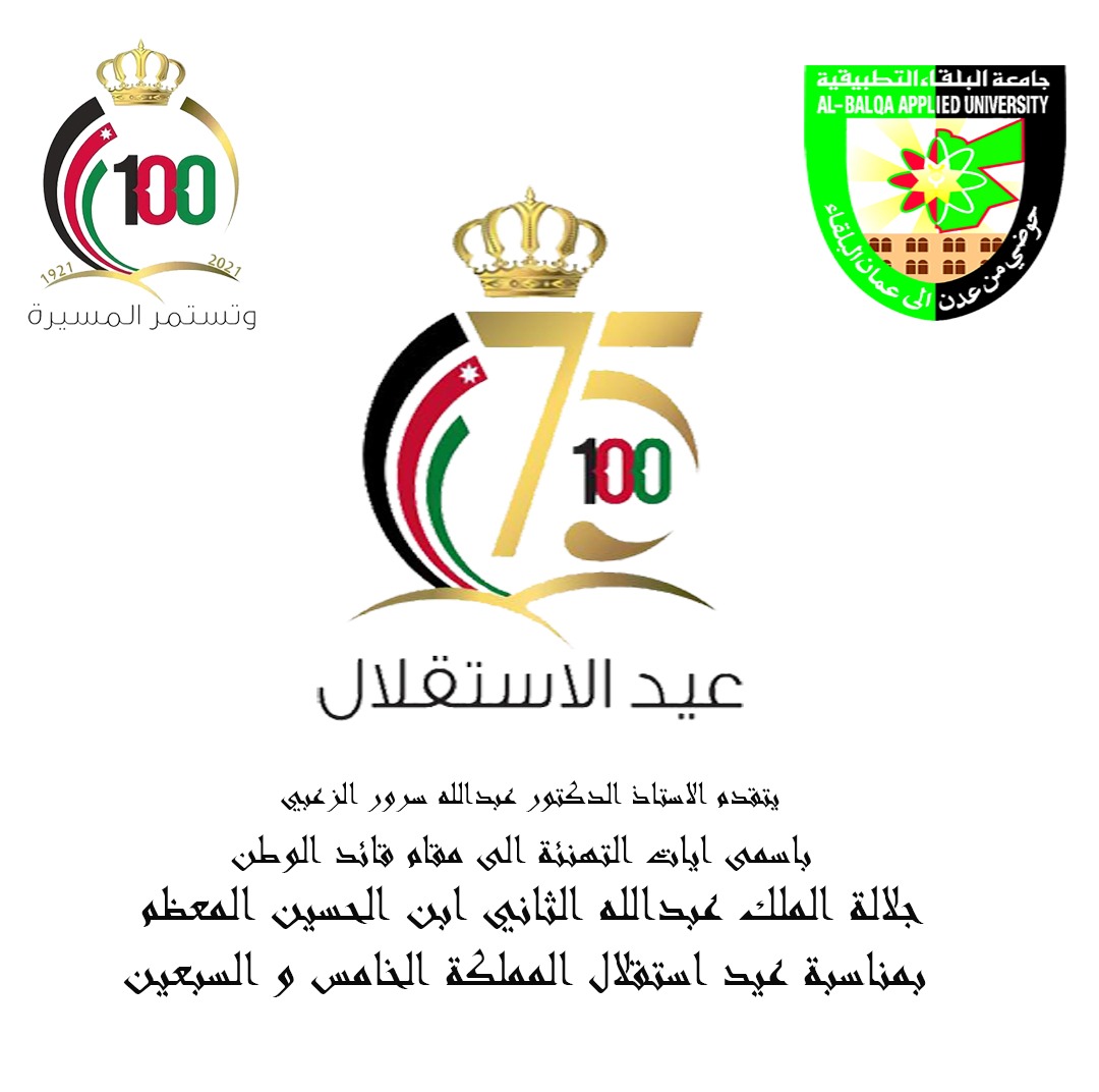 نحتفل جميعا اليوم مع أسرتنا الاردنية الواحدة بعيد استقلال مملكتنا الأردنية الهاشمية الخامس والسبعين، وبهذه المناسبة الأغلى على قلب كل اردني واردنية نتقدم باسمكم جميعا بالتهنئة والتبريك مقرونة بأنبل مشاعر الانتماء والولاء إلى قائدنا وراعي مسيرتنا المباركة وعنوان عزتنا جلالة الملك المعزز عبدالله الثاني ابن الحسين حفظه الله ورعاه وادامه سندا وذخرا للوطن والأمتين العربية والإسلامية.