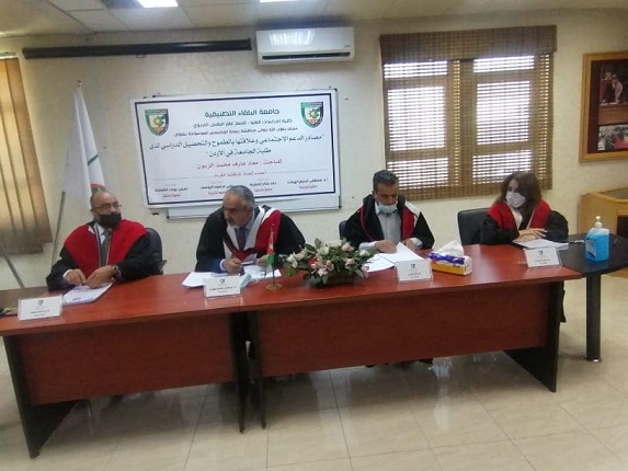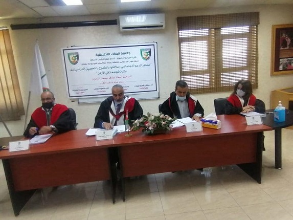 تم في صباح يوم الثلاثاء الموافق 4/5/2021 ، مناقشة رسالة ماجستير للطالب معاذ عارف محمد الزبون تخصص علم النفس التربوي، قسم علم النفس والتربية الخاصة بعنوان (مصادر الدعم الإجتماعي وعلاقتها بالطموح والتحصيل الدراسي لدى طلبة الجامعة في الأردن)