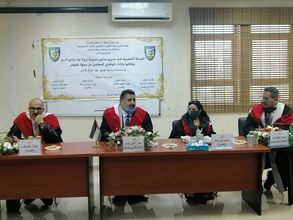 تم في صباح يوم الأحد الموافق 2021/5/23، مناقشة رسالة ماجستير للطالبة رسمية تيسير عبدالملك النادي تخصص الإدارة التربوية ،  قسم العلوم التربوية  بعنوان (العدالة التنظيمية لدى مديري مدارس مديرية تربية لواء وادي السير وعلاقتها بالاداء الوظيفي للمعلمين من جهة نظرهم)