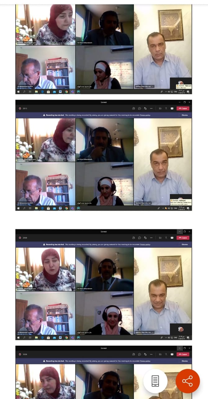 تم في صباح يوم الخميس الموافق 27/5/2021 مناقشة رسالة ماجستير عن بعد onlineللطالبة منار محمود محمد الهزاع تخصص الإدارة التربوية ، قسم العلوم التربوية بعنوان (دور استراتيجات الإدارة المرئية في تحققي الأداء المتميز في الجامعات الأردنية )