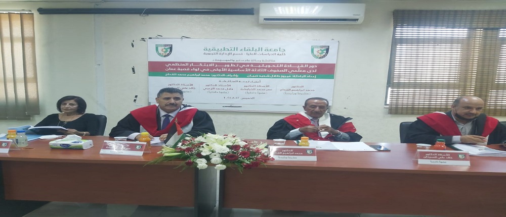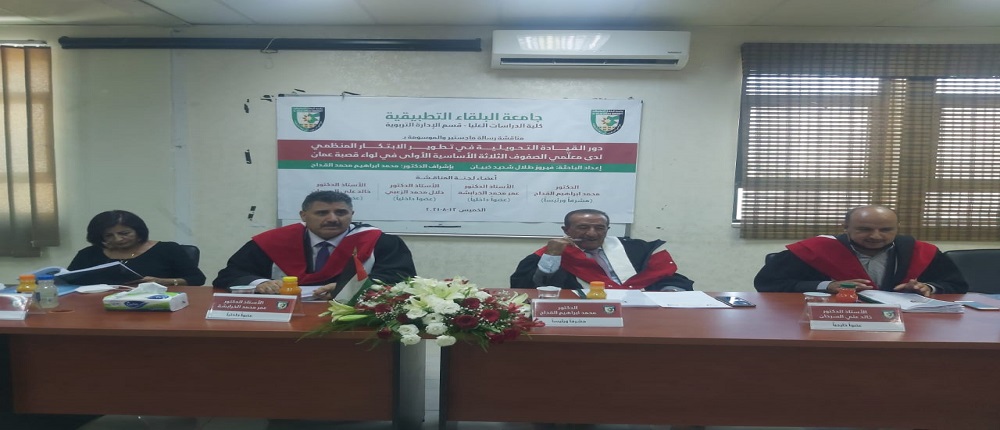 تم في صباح يوم الخميس الموافق 12/8/2021  ، مناقشة رسالة ماجستير للطالبة فيروز طلال شديد ذيبان  تخصص الإدارة التربوية ،  قسم العلوم التربوية  بعنوان ( دور القيادة التحويلية في تطوير الابتكار المنظمي لدى معلمي الصفوف الثلاثة الأساسية الأولى في لواء قصبة عمان)