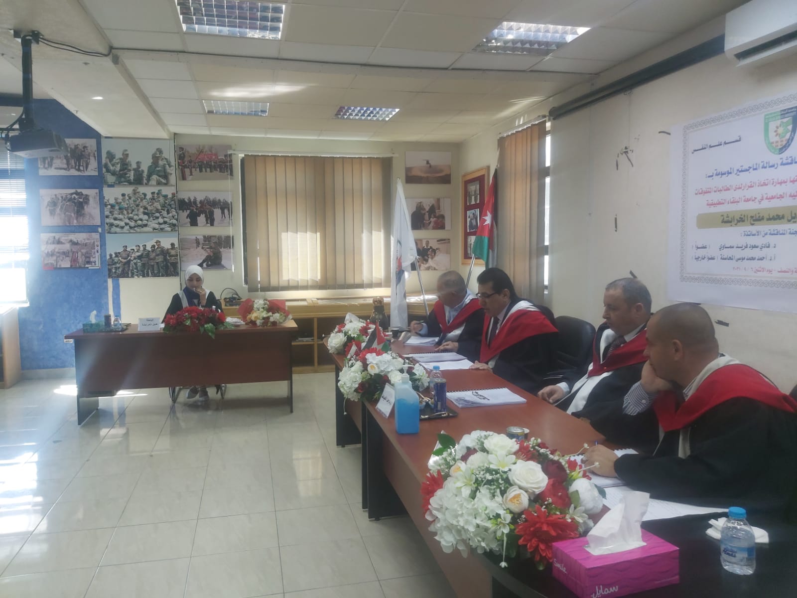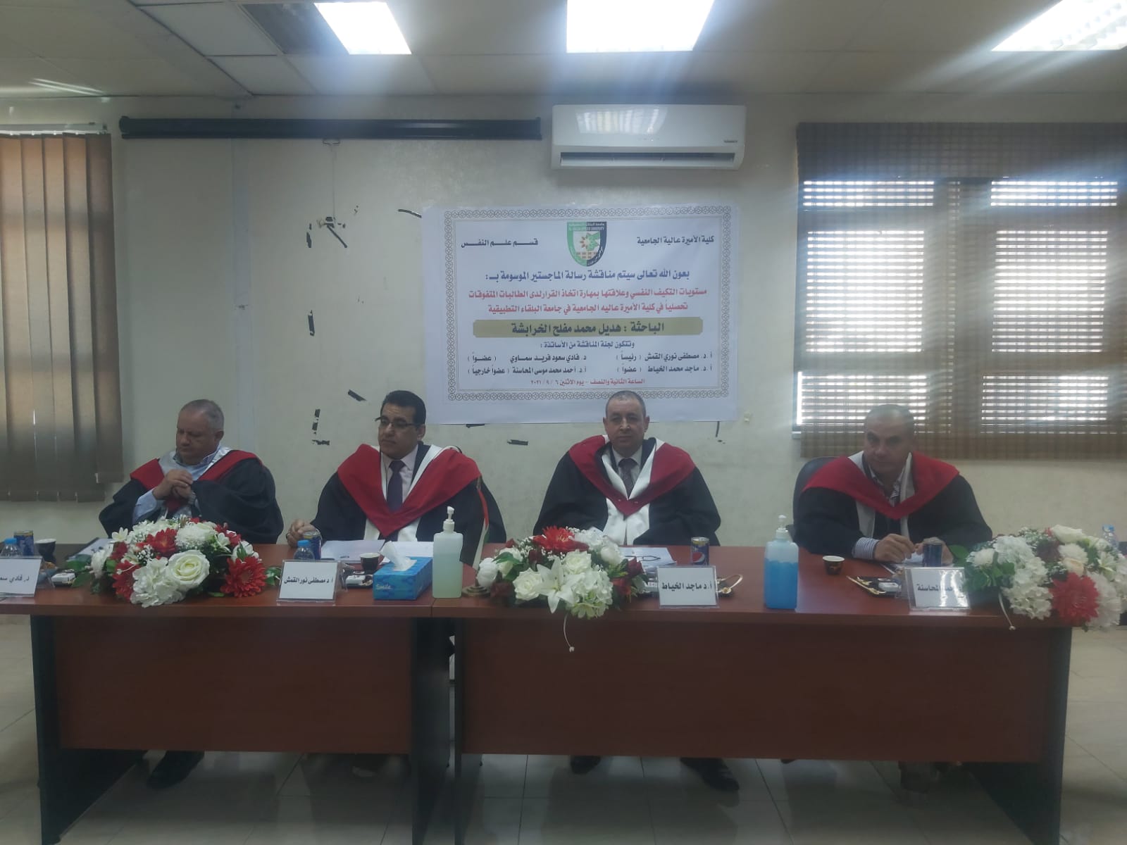 تم في صباح يوم الأثنين الموافق 6/9/2021 ، مناقشة رسالة ماجستير للطالبة هديل محمد مفلح الخرابشة تخصص علم النفس التربوي ، قسم علم النفس والتربية الخاصة بعنوان (مستويات التكيف النفسي وعلاقتها بمهارة اتخاذ القرار لدى الطالبات المتفوقات تحصلياً في كلية الأميرة عالية الجامعية في جامعة البلقاء التطبيقية )