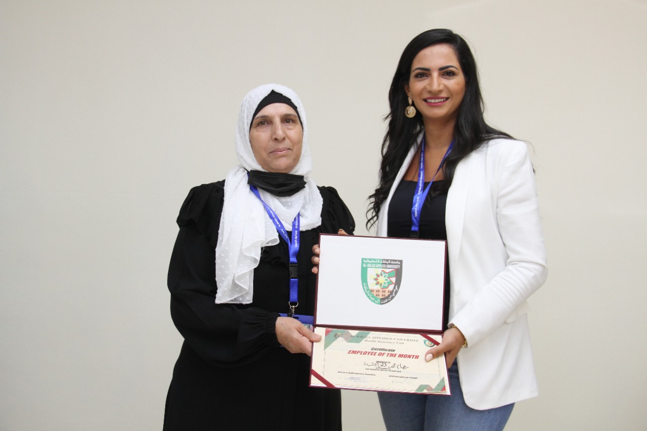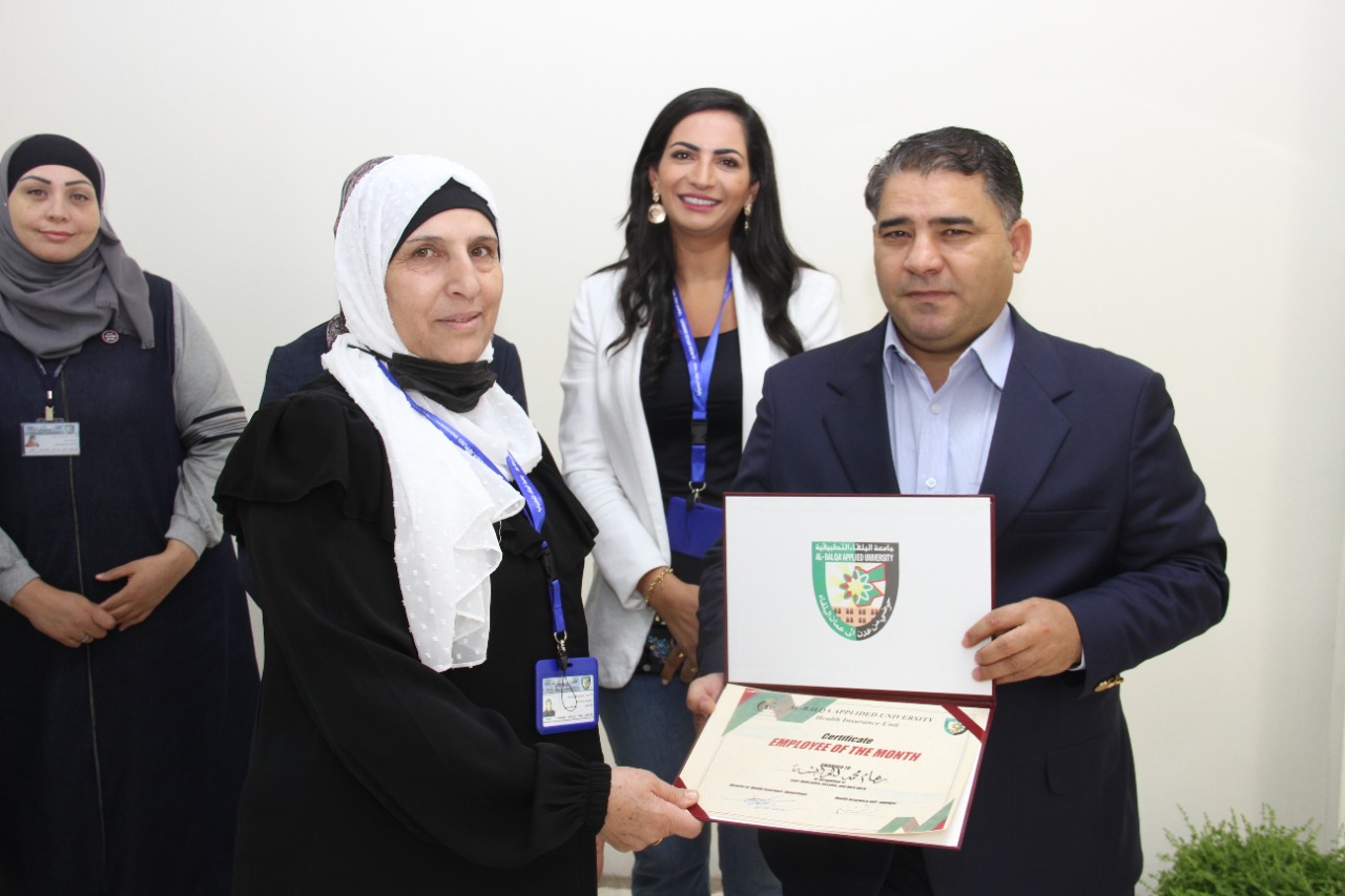 انسجامًا مع توجهات إدارة الجامعة في تحسين الأداء والتطوير وتحفيز قيم التنافس البناء في العمل لدى الموظفين سلم مدير وحدة التأمين الصحي الدكتور رعد البخيت بحضور مدير الدائرة الفنية للتأمين الصحي الدكتورة سوار ابو حمور شهادة الموظف المثالي عن شهر ايلول 2021 للموظفة رهام الخرابشه / الدائرة الفنية (شهادة تقديرية) تقديرا لجهودها المبذولة في تنفيذ الأعمال والواجبات بالسرعة والدقة المطلوبة، الأمر الذي ينعكس ايجابا على الخدمة التي تقدمها الجامعة للمشتركين وَالمنتفعين من خدمات التأمين الصحي.