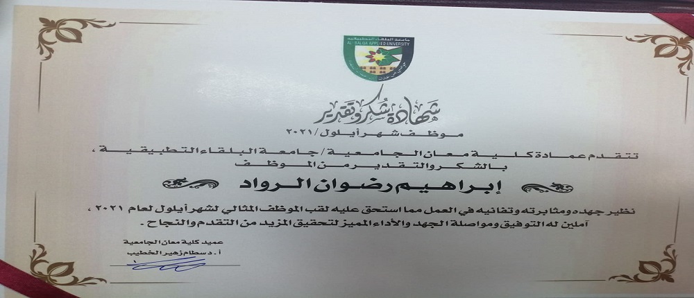 انسجاما مع توجهات إدارة جامعة البلقاء التطبيقية ممثلة برئيسها الأستاذ الدكتور عبدالله سرور الزعبي في تحسين الأداء الوظيفي وتطويره، وتحفيز قيم التنافس البنّاء في العمل لدى الموظفين، سلم عميد كلية معان الجامعيّة الأستاذ الدكتور سطام زهير الخطيب شهادة الموظف المثالي (شهادة تقديرية) عن شهر أيلول 2021 للموظف إبراهيم رضوان الرواد / شعبة الخدمات، بحضور نائب العميد ومساعديه ورؤساء الأقسام.
