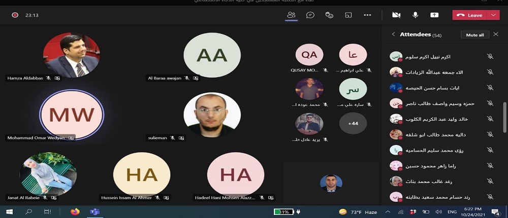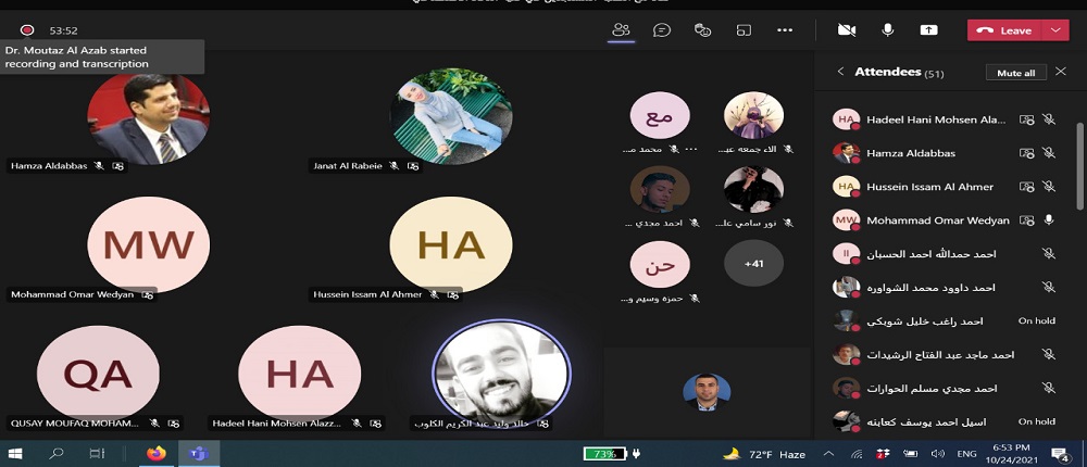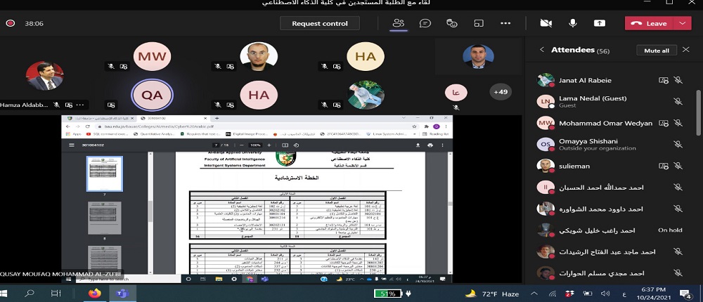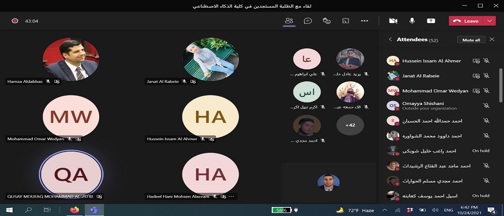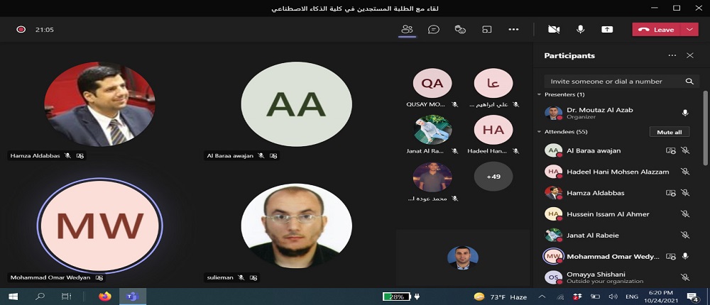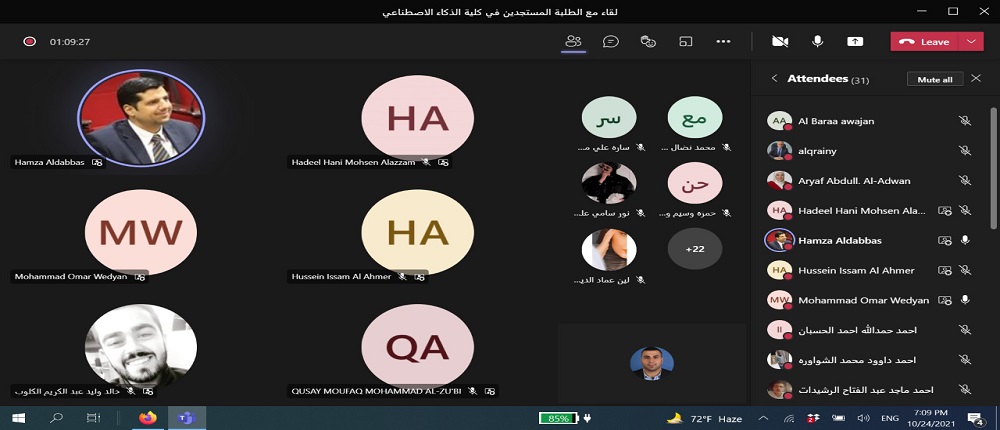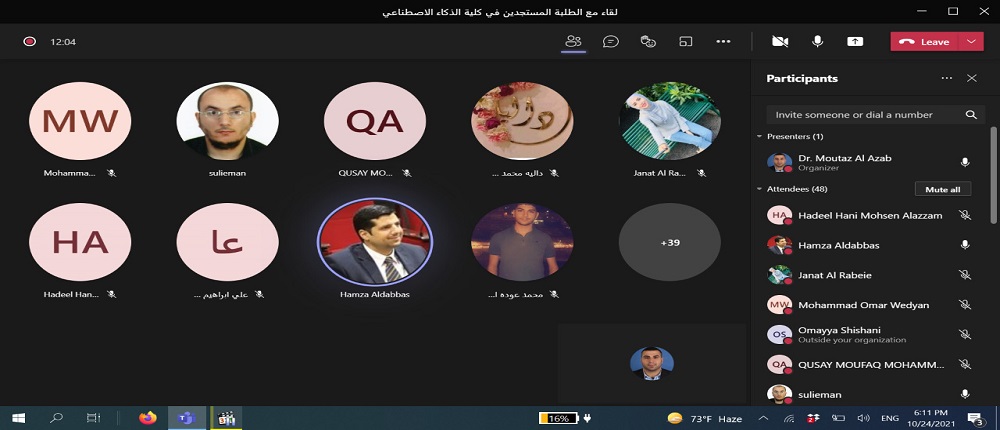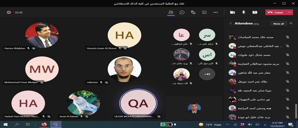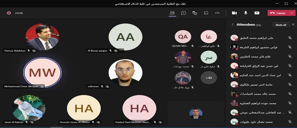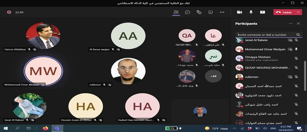 انطلاقاً من حرص جامعة البلقاء التطبيقية و توجيهات عطوفة الاستاذ الدكتور عبدالله الزعبي رئيس الجامعة بالتواصل الدائم مع الطلبة التقى الدكتور حمزة الدباس عميد كلية الذكاء الاصطناعي طلبة الكلية الجدد وفي كافة التخصصات الكلية الخمس: الذكاء الاصطناعي والروبوتات، علم البيانات، الواقع الافتراضي، امن المعلومات والفضاء الالكتروني ،والتحقيقات الجنائية الرقمية. وقد حضر اللقاء رؤساء الأقسام الأكاديميه ومساعدو العميد وأعضاء الهيئة التدريسية في الكلية باستخدام برمجية ميكروسوفت تيمز.