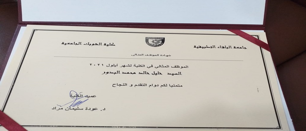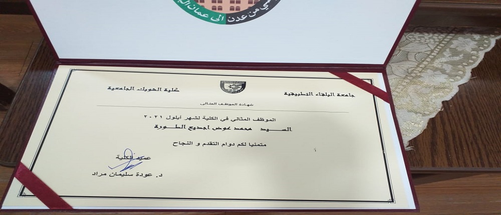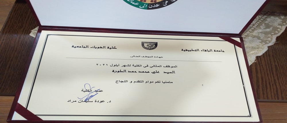 كلية الشوبك الجامعية تمنح شهادة الموظف المثالي لعدد من الموظفين عن شهر ايلول 2021