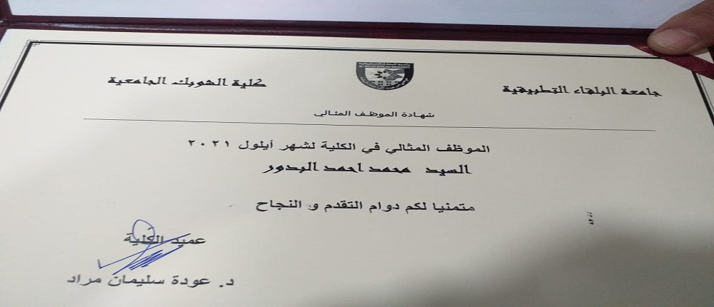 تقديرا لجهودهم " كلية الشوبك الجامعية تمنح شهادة الموظف المثالي " لعدد من الموظفين انسجامًا مع توجهات إدارة الجامعة ممثله برئيسها الاستاذ الدكتور عبدالله سرور الزعبي في تحسين الأداء والتطوير وتحفيز قيم التنافس البناء في العمل لدى الموظفين سلم عميد كلية الشوبك الجامعية الدكتور عوده مراد  شهادة الموظف المثالي عن شهر ايلول 2021 للموظفين السيد محمد احمد البدور والسيد خليل خالد البدور والسيد علي محمد الطوره والسيد محمد عوض الطوره  في الكلية تقديرا لجهودهم المخلصة وعطاءهم المتميز في تنفيذ الاعمال والواجبات المطلوبة منهم على أكمل وجه.