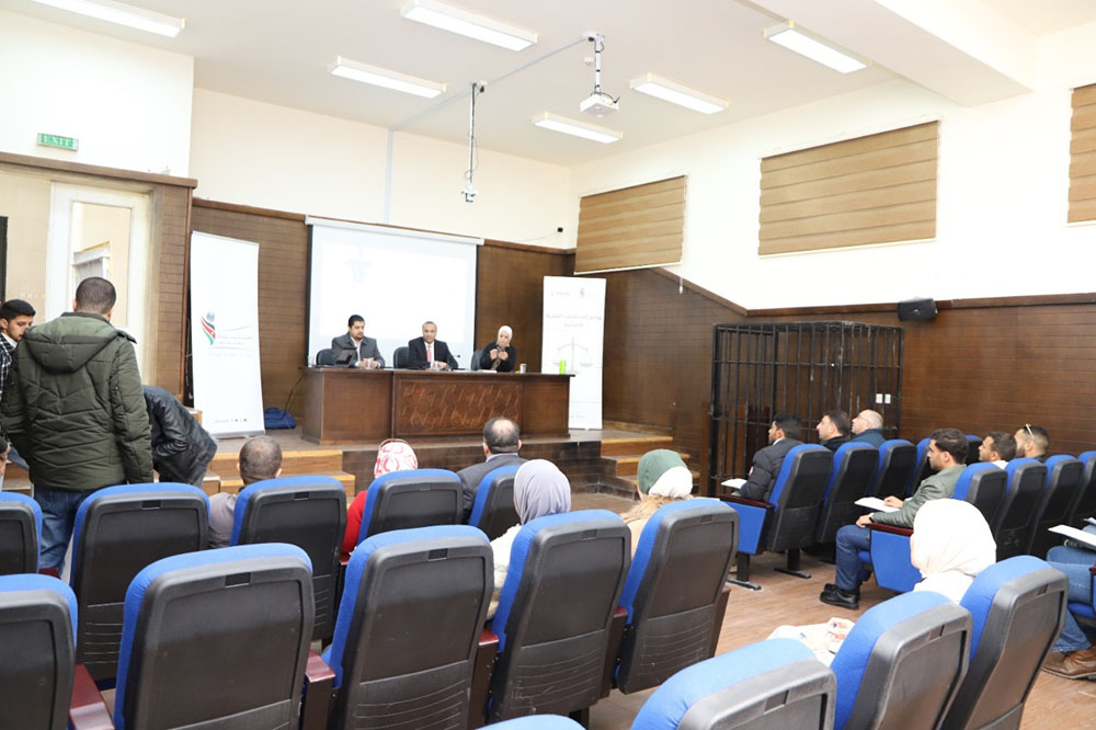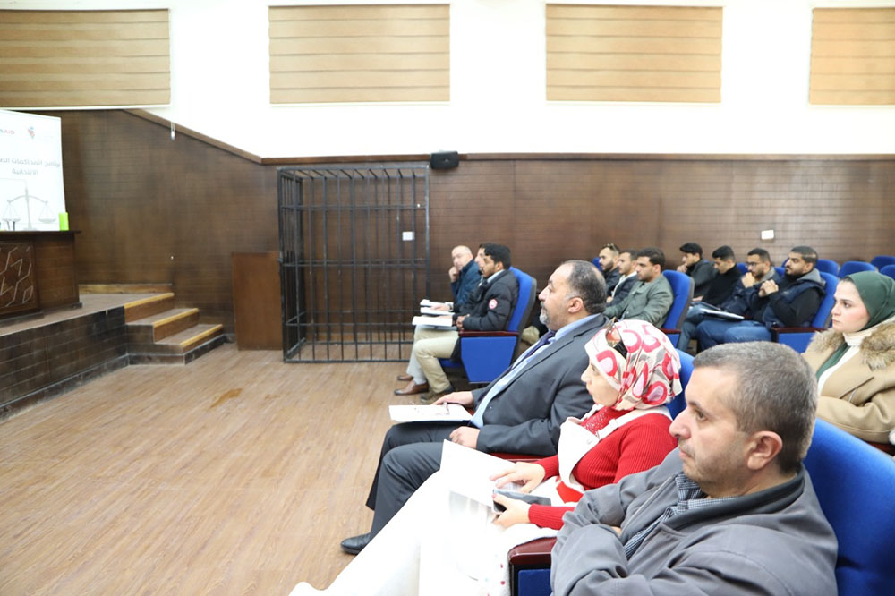 كما ختم المحامي ابو سويلم الحديث عن شمول البرنامج التدريبي بمسابقة المحكمة الصورية موضحا ان المسابقة تتضمن الشروط والإحكام ومهارات الترافع والإلقاء ولغة الجسد ومهارات التواصل والتفاعل مع الهيئة الحاكمة ومهارات الاستماع والرد على مرافعة الفريق الثاني .