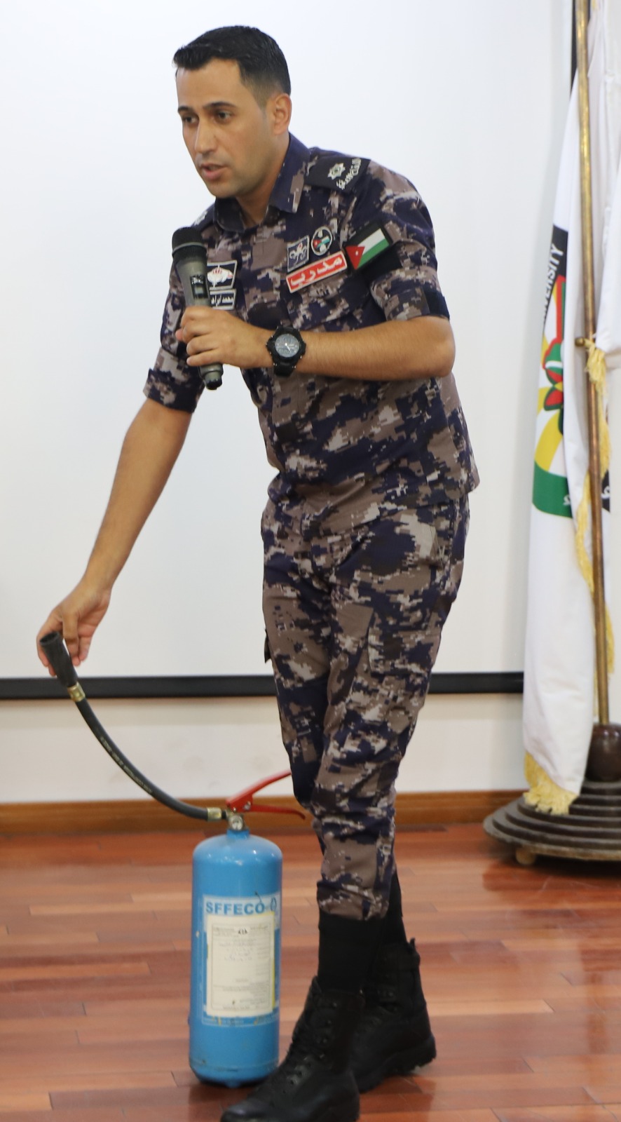 كما تحدث الملازم القطارنه عن معلومات نظرية وعملية تتعلق بطفايات الحريق وأنواعها وكيفية التعامل معها بحرفية ومهنية عاليتين