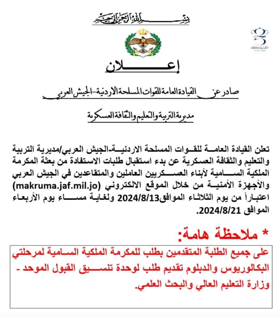 اعلان صادر عن القياده العامة للقوات المسلحة الاردنيه -الجيش العربي مديرية التربيه والتعليم والثقافه العسكريه