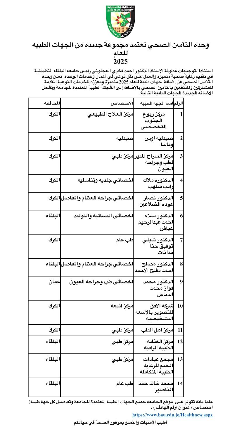 وحدة التأمين الصحي في جامعة البلقاء التطبيقية تعتمد مجموعة جديدة من الجهات الطبية للعام 2025