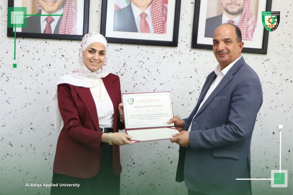 في إطار سعي جامعة البلقاء التطبيقية إلى تعزيز الأداء الوظيفي وترسيخ قيم التميز والتنافس الإيجابي، كرّم مدير الدائرة القانونية الأستاذ الدكتور مراد الشنيكات الموظفة عبلة جمال الريالات بتسليمها شهادة الموظف المثالي لشهر تموز 2025، وذلك بحضور مساعد مدير الدائرة السيد عماد الدبعي وأسرة الدائرة.
