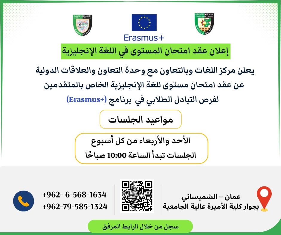 يعلن مركز اللغات  وبالتعاون مع وحدة التعاون والعلاقات الدولية عن عقد امتحان تحديد مستوى اللغة الإنجليزية للراغبين في التقدم لبرامج التبادل الأكاديمي (+Erasmus) بين جامعة البلقاء التطبيقية والجامعات والهيئات الدولية.