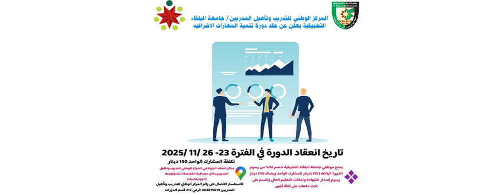 يعلن المركز الوطني للتدريب وتأهيل المدربين / جامعة البلقاء التطبيقية عن عقد دورة تنمية المهارات الاشرافية وذلك في الفترة من 23 – 26 / 11 / ...