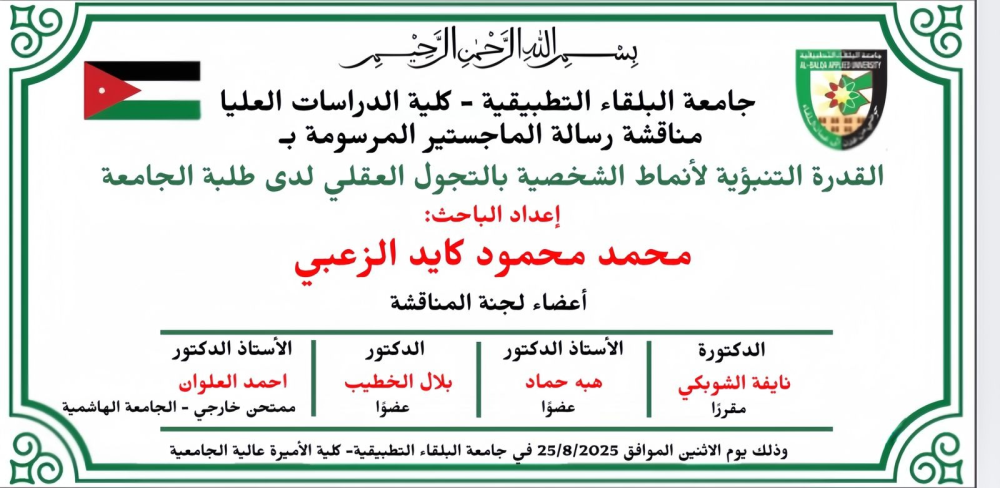 مناقشة رسالة ماجستير للطالب محمد محمود كايد الزعبي في كلية الأميرة عالية الجامعية