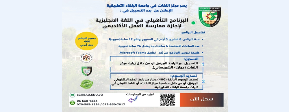 يعلن المسجل العام في جامعة البلقاء التطبيقية عن استمرارية تتقديم طلبات الالتحاق على البرنامج الموازي للفصل الاول من العام الجامعي 2025/2026 لت ...   التفاصيل