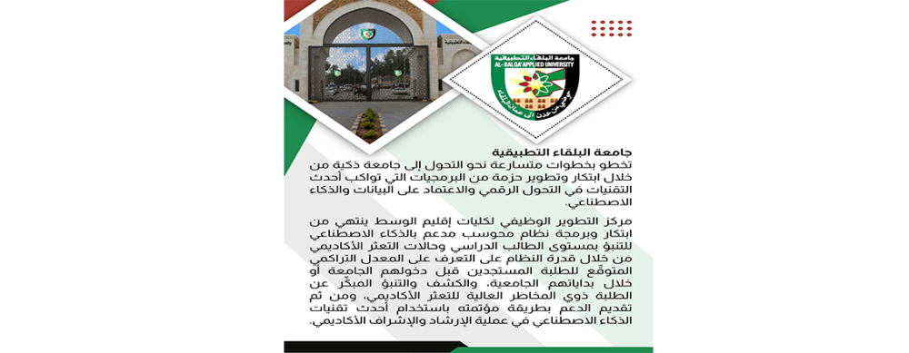 جامعة البلقاء التطبيقية تخطو بخطوات متسارعة نحو التحول إلى جامعة ذكية من خلال ابتكار وتطوير حزمة من البرمجيات التي تواكب أحدث التقنيات في التحول الرقمي والاعتماد على البيانات والذكاء الاصطناعي