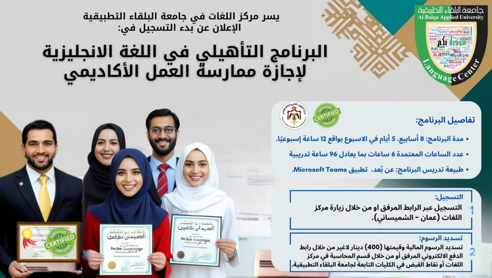 يُعلن مركز اللغات – جامعة البلقاء التطبيقية عن فتح باب التسجيل في: