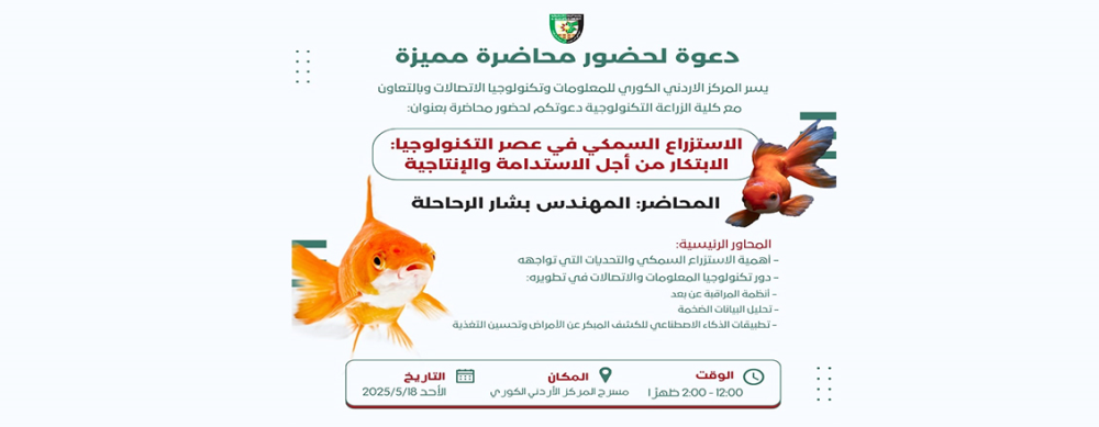 يسر المركز الاردني الكوري للمعلومات وتكنولوجيا الاتصالات وبالتعاون مع كلية الزراعة التكنولوجية دعوتكم لحضور محاضرة بعنوان: (الاستزراع ...
