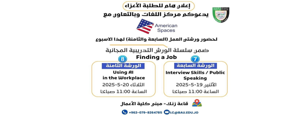 يسر مركز اللغات وبالتعاون مع American Spaces دعوتكم لحضور الورشتين السابعة والثامنة من سلسلة ورش Finding a Job