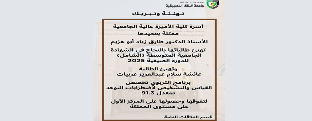 يعلن المسجل العام في جامعة البلقاء التطبيقية عن عقد الامتحان النهائي (غير المكتمل) للفصل الدراسي الثاني والصيفي من العام الجامعي 2024-2025 يوم الثلاثا ...