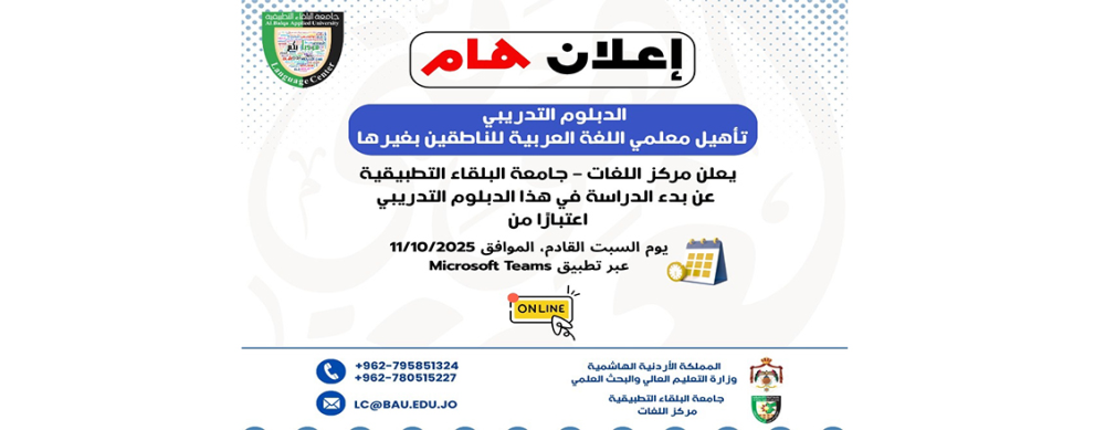 يسرّ مركز اللغات – جامعة البلقاء التطبيقية أن يعلن عن انطلاق الدراسة في الدبلوم التدريبي: