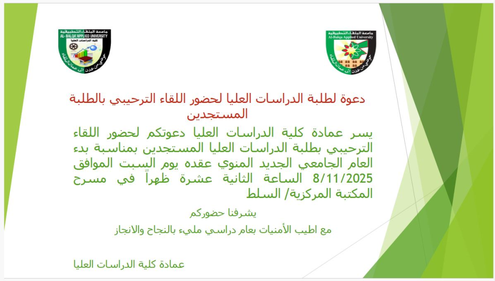 يعلن المسجل العام في جامعة البلقاء التطبيقية بانه قد تقرر تمديد فترة استكمال اجراءات تسجيل الطلبة المستجدين والذين حصلوا على قبول في الجامعة ل ...