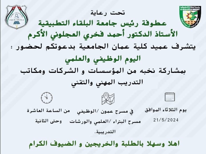 انطلاقًا من حرص جامعة البلقاء التطبيقية المستمر لتحفيز الريادة والتميز وسعياً منها لتأهيل طلبتها اكاديماً ومهنياً رعى عميد كلية عمان الجامعية الأستاذ ...
