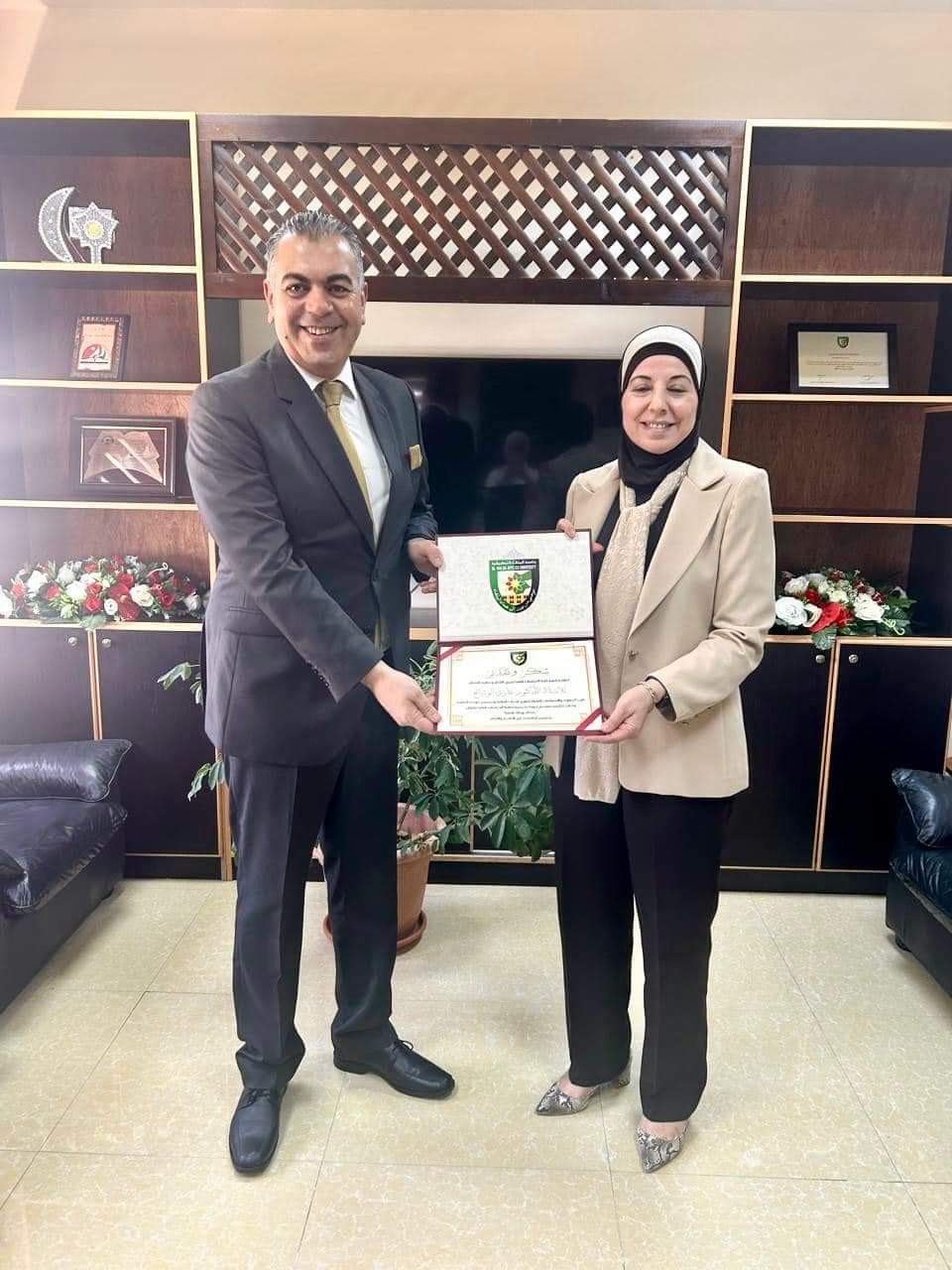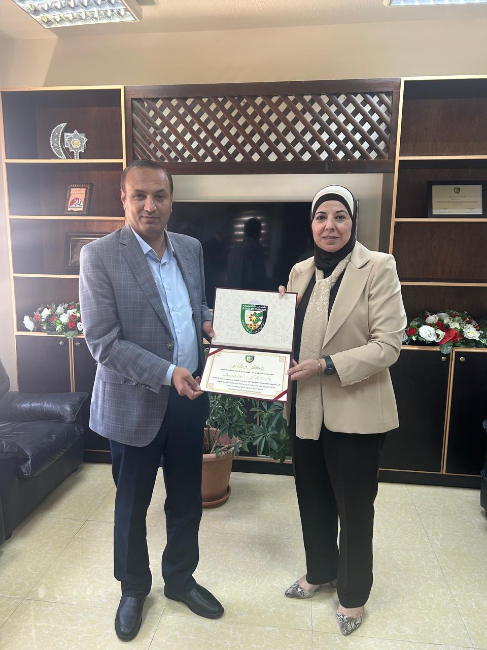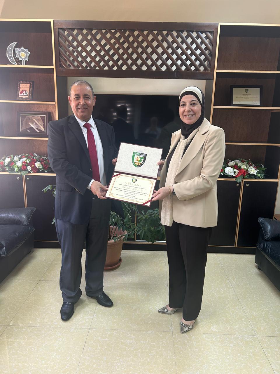 عميدة كلية الدراسات العليا تكرم الاستاذ الدكتور احمد نعيمات بمنحه شهادة شكر وتقدير لتكرمه بتقديم دورة حول كيفية كتابة مشروع خطة رسالة الماجستير لطلبة برنامج القانون الخاص في كلية الدراسات العليا