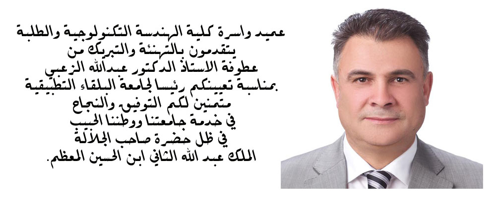 عميد واسرة كلية الهندسة التكنولوجية والطلبة يتقدمون بالتهنئة والتبريك من عطوفة الاستاذ الدكتور عبدالله الزعبي بمناسبة تعيينكم رئيسا لجامعة البلق ...
