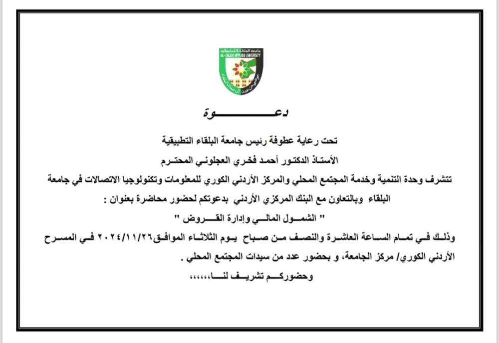 جامعة البلقاء التطبيقية تعزز الشمول المالي وتمكين المرأة بمحاضرة توعوية بالتعاون مع البنك المركزي