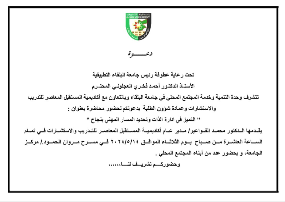 (ادارة الذات وتحديد المسار المهني بنجاح ) محاضرة في البلقاء التطبيقية