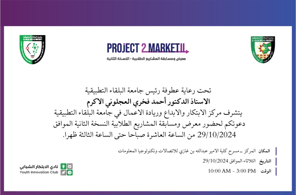 جامعة البلقاء التطبيقية تطلق النسخة الثانية من مسابقة ومعرض المشاريع الطلابية مسابقة Project2Market