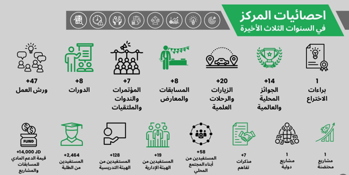 ونحن في مركز الابتكار والابداع والريادة وانطلاقا من استراتيجية الجامعة المنسجمة مع الرؤية الملكية لتنمية الموارد البشرية والتي ركيزتها الاساسية الاستثمار في مستقبل ابنائنا عماد نهضتنا وثروتنا، نحرص كل الحرص على توفير بييئة خصبة وملائمة ومحفزة لدعم الطلبة واعضاء الهيئتين التدريسية والادارية والمجتمع المحلي من اجل مواكبة تحديات هذا العصر بأدواته المعرفية ووسائل التقنية الحديثة والتي تدعم الفكر الابتكاري والريادي وتعزيز المفاهيم الخاصة بها، والتشجيع على انشاء وتنفيذ المشروعات الريادية الخاصة، وتنمية روح الميادرة وتسليط الضوءعليها .