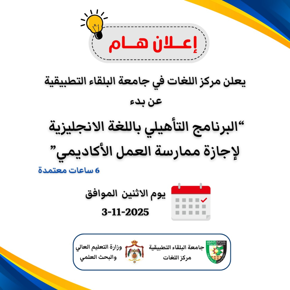 يُعلن مركز اللغات – جامعة البلقاء التطبيقية عن فتح باب التسجيل في: البرنامج التأهيلي باللغة الإنجليزية لإجازة ممارسة العمل الأكاديمي ا ...